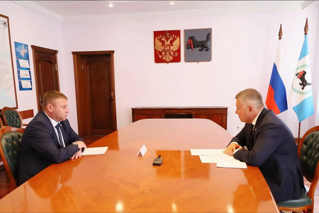 Фото: Александр Шуваев беседует с губернатором Иркутской области Игорем Кобзевым. Пресс-служба губернатора и правительства Иркутской области